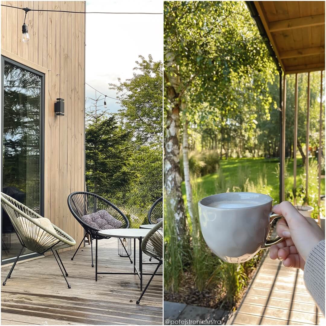 Domki są całkiem spore i można w nich wygodnie wypoczywać 4-6 osobową rodziną. Dla naszej dwójki z psem przestrzeń była bardzo komfortowa. Na parterze znajduje się w pełni wyposażona kuchnia z wyspą, spory stół w jadalni, przestronny salon z telewizorem i duża łazienka z sauną. No i oczywiście taras. Na górze zaś są trzy sypialnie i mały salonik z kanapą, stolikami i lampą.